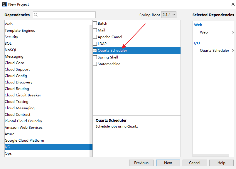 一般在项目中,除非定时任务涉及到的业务实在是太简单,使用 @Scheduled 注解来解决定时任务,否则大部分情况可能都是使用 Quartz 来做定时任务。在 Spring Boot 中使用 Quartz ,只需要在创建项目时,添加 Quartz 依赖即可: