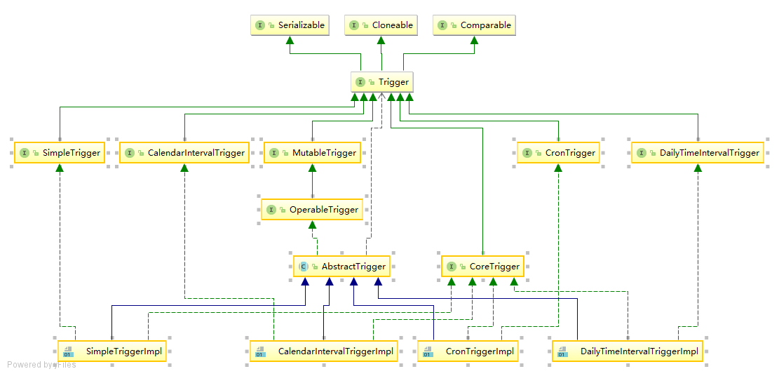 - Trigger 是指触发器,Quartz 中定义了多个触发器,这里向大家展示其中两种的用法,SimpleTrigger 和 CronTrigger 。