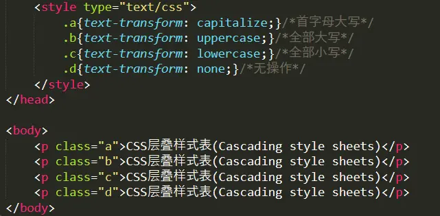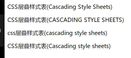| text-transform | 文本的大小写 capitalize(首字母大写) | uppercase(大写) | lowercase(小写) | none |
