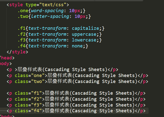 系统以空格来评判英文单词和中文,若中文之间有空格则也会改变间距,属性值可以设置为正也可以设置为负,负值的结果字母重叠