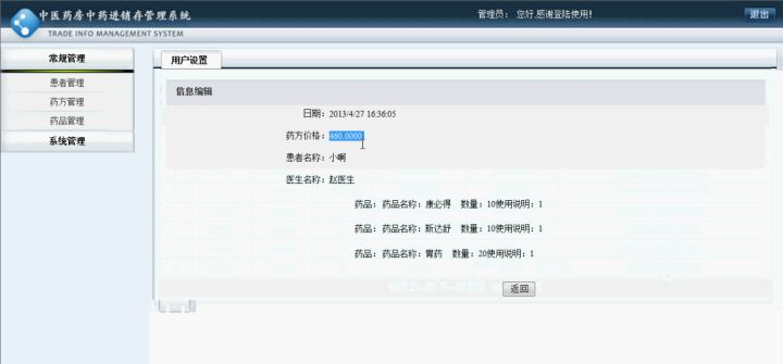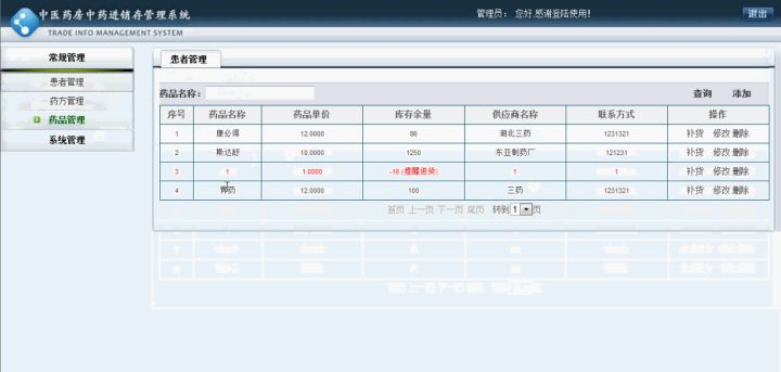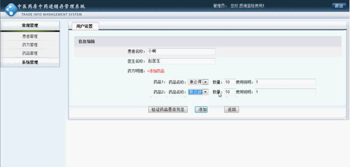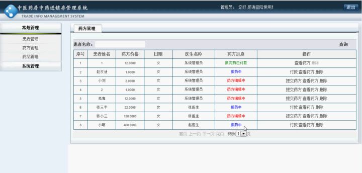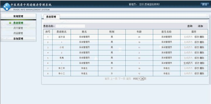 功能包含【患者管理】【药方管理】【药品管理】【系统管理】,具体功能如下