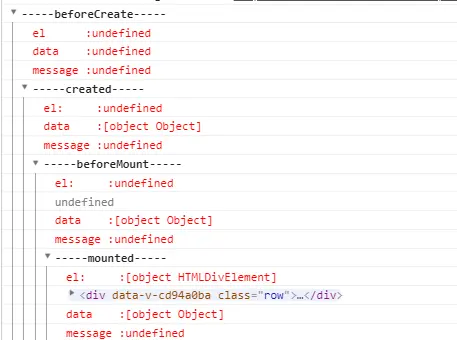 3、beforeMount和mounted之间,此时是给vue实例对象添加$el,并且替换掉挂载DOM元素。beforeMount中属性还是以虚拟DOM存在的,mounted之后发生了变化。