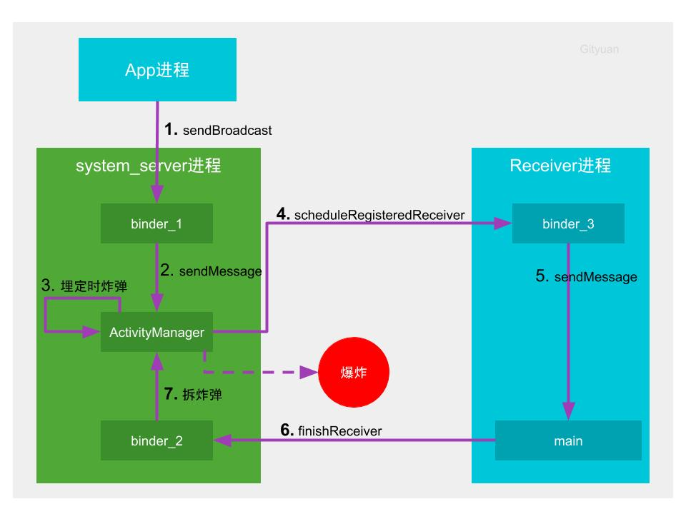 中控系统的通信员2号接收到该信息后,向组件管家(ActivityManager线程)发送消息,埋下炸弹