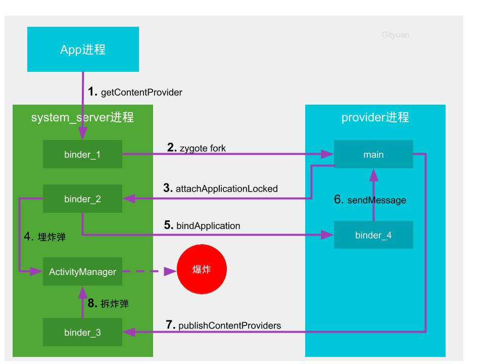 客户端(App进程)向中控系统(system_server进程)发起获取内容提供者的请求