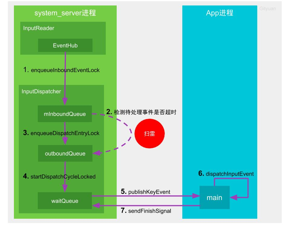 InputReader线程负责通过EventHub(监听目录/dev/input)读取输入事件,一旦监听到输入事件则放入到InputDispatcher的mInBoundQueue队列,并通知其处理该事件; InputDispatcher线程负责将接收到的输入事件分发给目标应用窗口,分发过程使用到3个事件队列: mInBoundQueue用于记录InputReader发送过来的输入事件; outBoundQueue用于记录即将分发给目标应用窗口的输入事件; waitQueue用于记录已分发给目标应用,且应用尚未处理完成的输入事件; input的超时机制并非时间到了一定就会爆炸,而是处理后续上报事件的过程才会去检测是否该爆炸,所以更像是扫雷的过程,具体如下图所示。