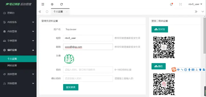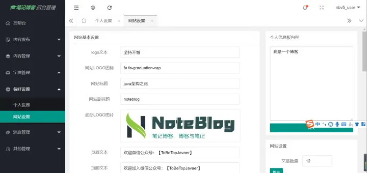 首先我们可以进行个人设置和网站设置: