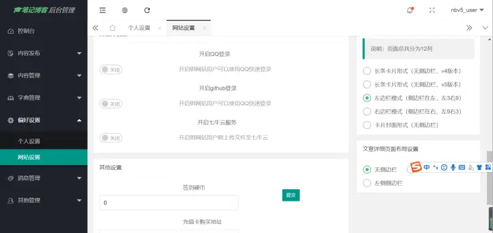 可以设置页面展示风格,和开启qq登录,github登录。