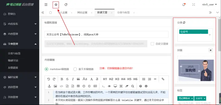 设置完成后,我们可以去发布一篇文章: