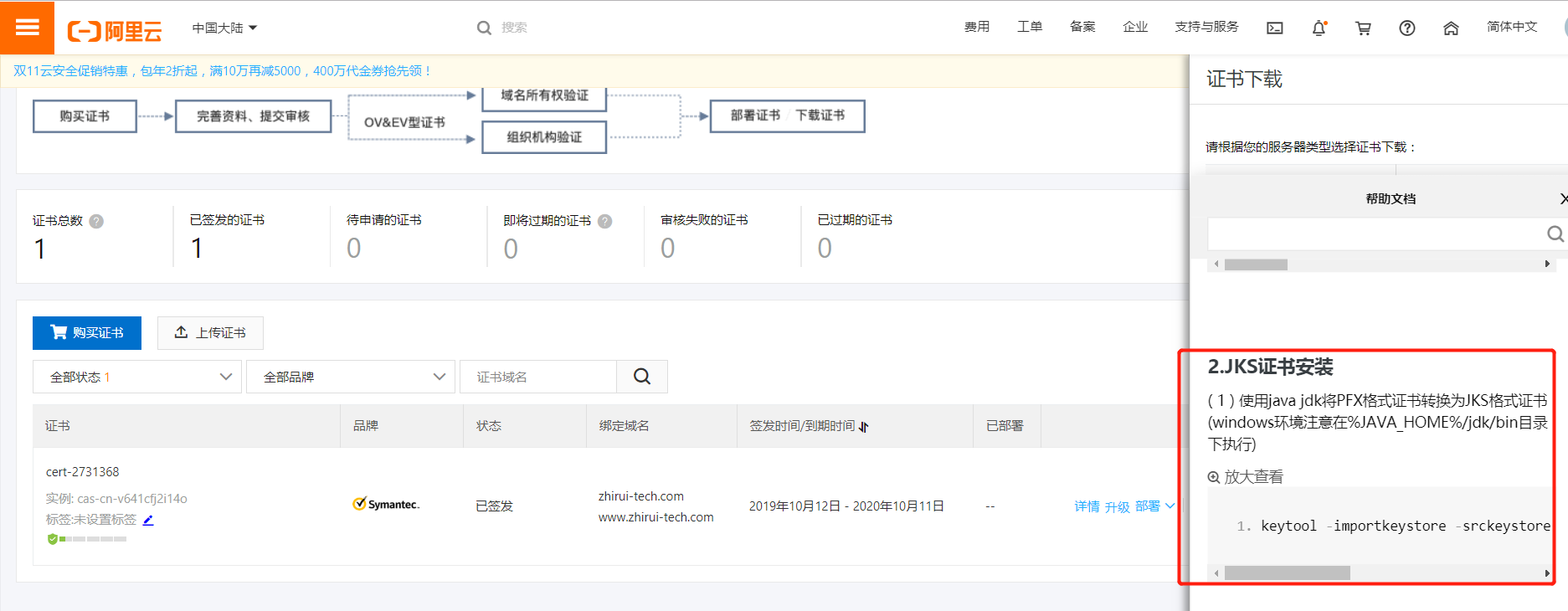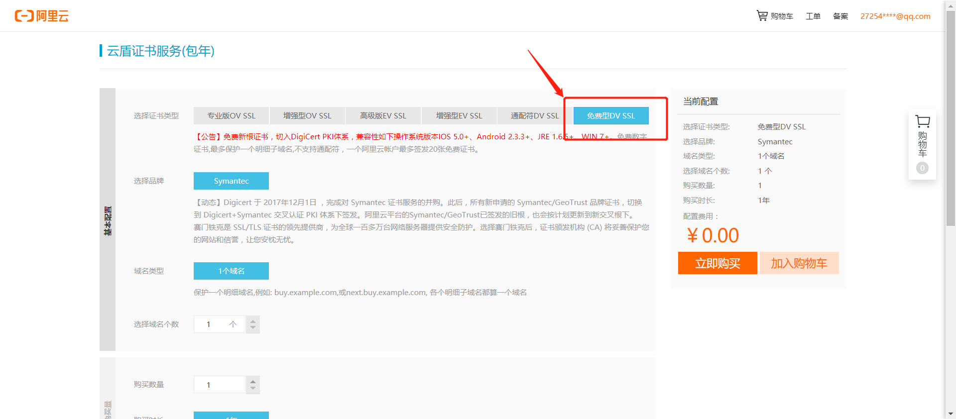 点击购买可以申请免费的证书
