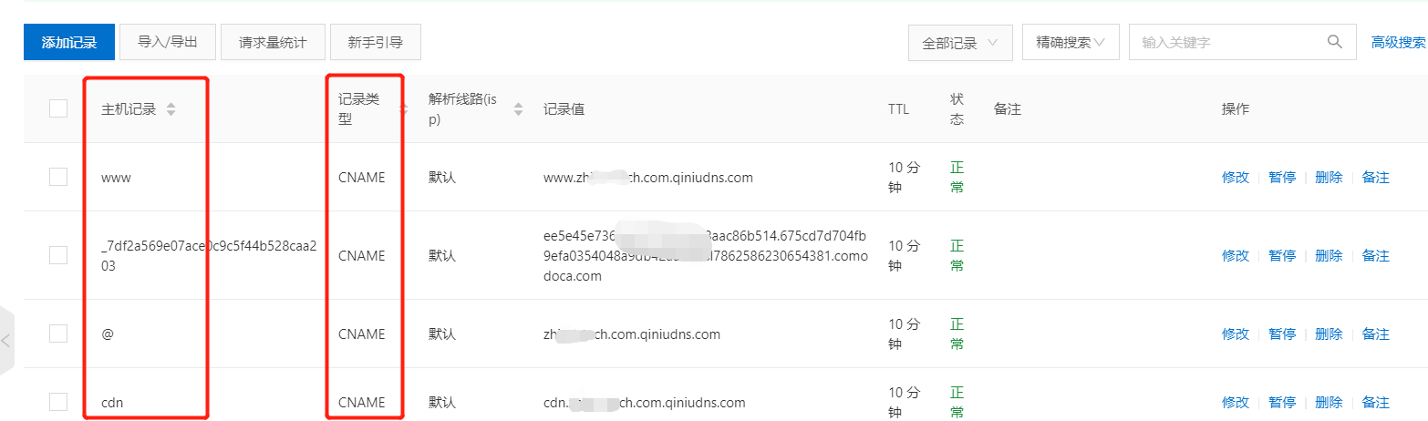 点击 添加记录,配置cname, 粘贴上在七牛云复制的cname。记录类型选择cname,主机记录根据记录值来填写: