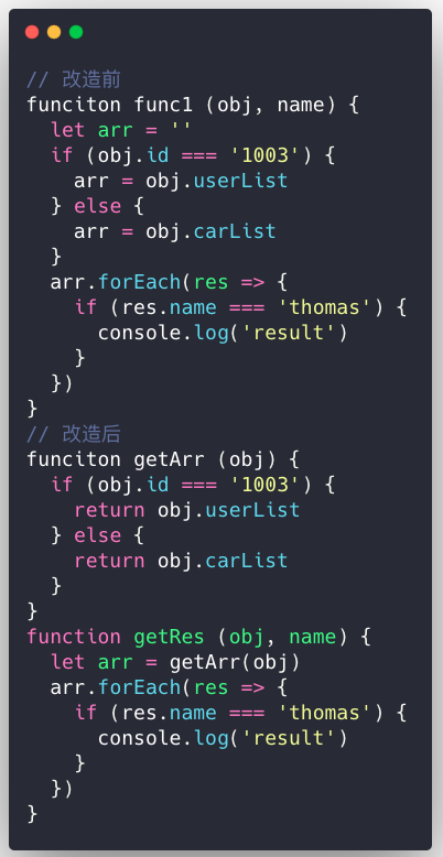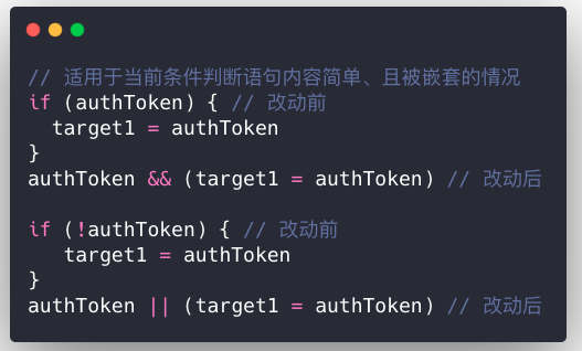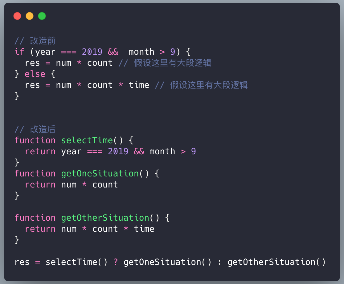 - 如果判断逻辑比较复杂,以函数取代判断条件,并以函数取代执行函数,最后以三元运算符将几个函数串起来,一方面增强了代码的语义化,另一方面提高了代码可读性,建议将比较复杂的执行逻辑封装为一个函数