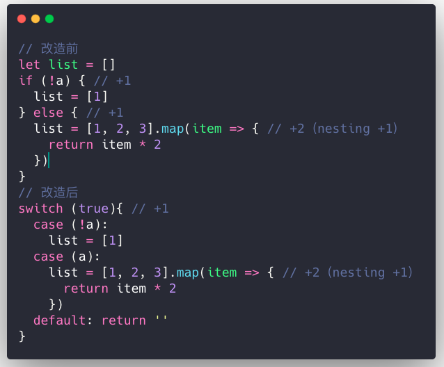 嵌套结构的语句会受到嵌套的额外加分,若当前语句较简单,且处于嵌套中,可以使用下面方式进行改写