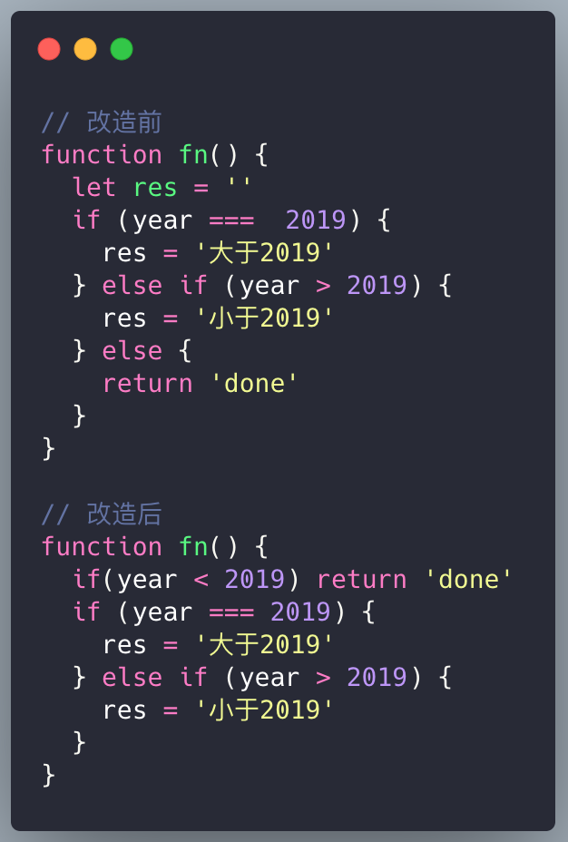 - 将结束函数的判断条件语句前置,可以方便理解,也可以减少不必要的代码执行