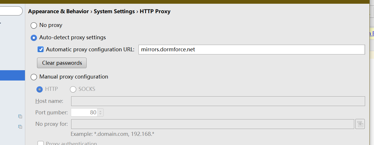1.1 设置proxy,因国内限制,使用镜像,安装过程中遇到需要设置proxy时可先点击取消,新建工程后,再进行设置 File->Settings->使用镜像:mirrors.dormforce.net