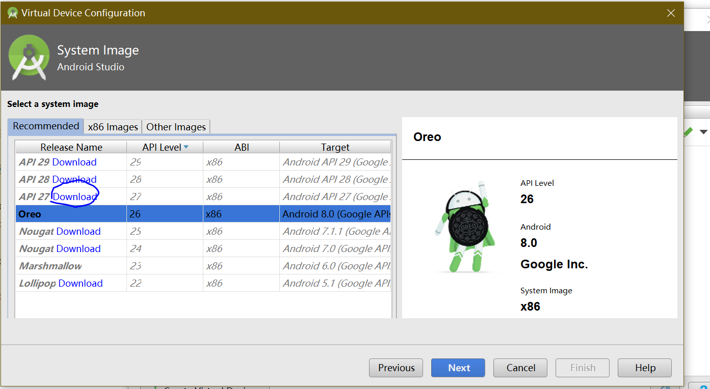 1.1 点击AVD 图标 1.2 选择设备型号-》选择API Download->打开模拟器