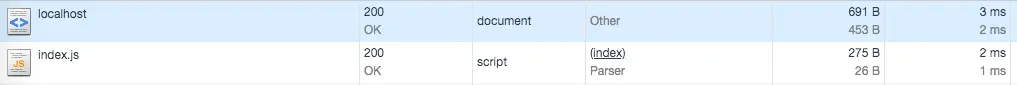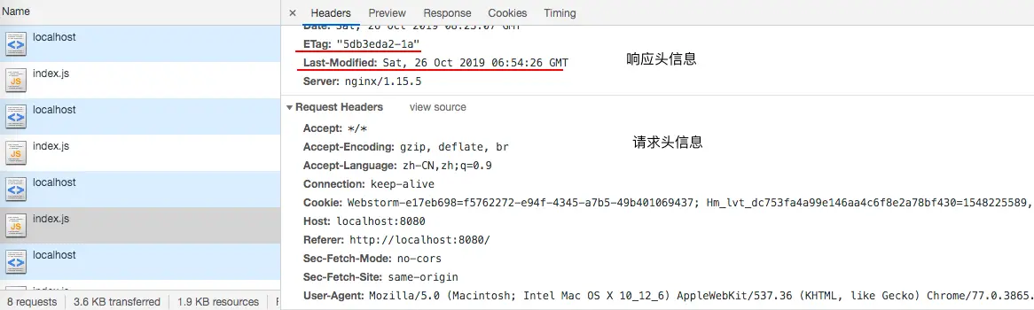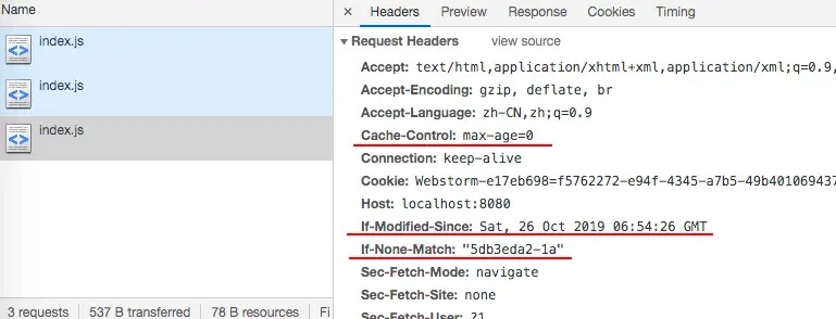 对照我的例子,我是这样理解的:index.html 文件刷新页面命中协商缓存返回了 304,而 js 文件是在 index.html 文件中链接引入的,所以命中强缓存 200 OK (from cache) 。为了验证我的想法,我用在地址栏直接访问了 index.js 文件。地址栏键入:localhost:8080/index.js,此时的确是返回了 304 给我了,在来看一下此时的请求头: