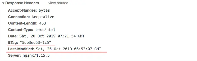 可以看到第一次访问,两条请求的状态码都是 200。我们点开其中一条请求看看响应头信息: