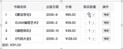 - 点击移除:给移除绑定点击事件,获取index,然后点击一下,直接用books[index].splice(index,1)达到删除一行的操作。