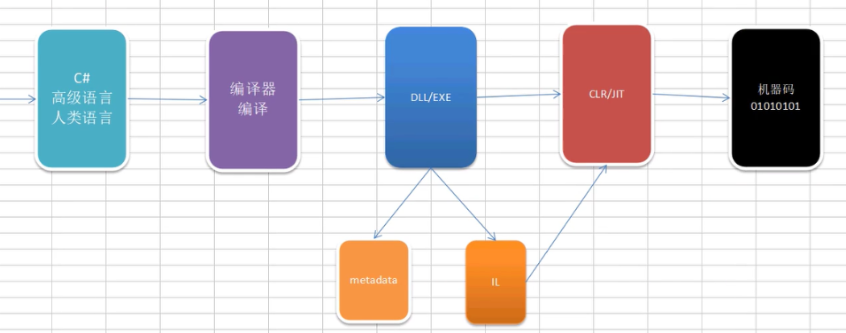 .NET编译器和解释器两阶段,我们先经过编译器编译成IL中间语言(dll、exe),和java的字节码类似,然后经过JIT解释成机器码。这样做的好处就是我们只需要编译成IL后,在各个不同计算机系统上,只要有对应的CLR(JIT)就行,这样就和平台无关。二次编译:为了一次编译,不同平台使用