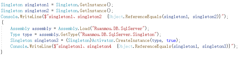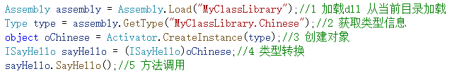 Type的获取,可以从对象获取,类名获取或类全路径获取(通过配置项实例化类很方便)。Activator.CreateInstance(type)创建类实例。加载dll创建某个实例用的都只是字符串,既然是字符串那么就可以放在配置中。像下面这种如果要换个国家的人来打招呼就需要替换红色字符即可。(前提当然是每个国家的人都继实现ISayHello打招呼接口)。依赖于具体类型改为依赖字符配置文件了。