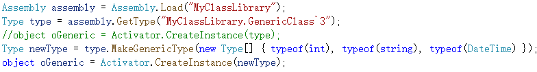 还有一种泛型类型的反射创建比较特殊。假设有以下泛型类,那么在GetType时候需要使用“`”(反单引号)占位符,这个符号键盘上一般在ESC键下方或数字1键的左边。后接数字表示需要多少个泛型类型,然后指定具体的类型通过MakeGenericType再次创建出Type。