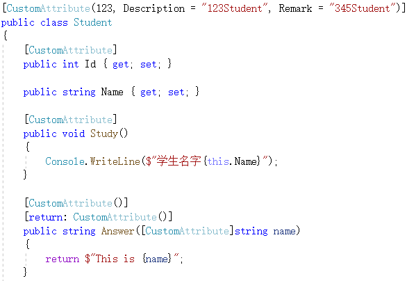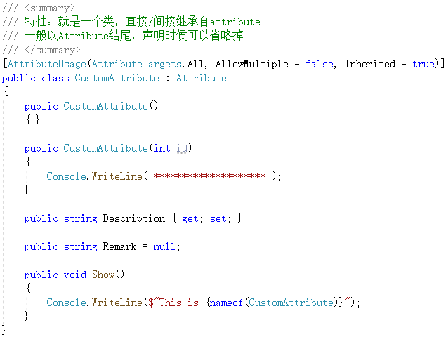 除了.NET框架内置的特性,我们通过继承Attribute可以自定义一个特性。例子中AttributeUsage是专用于标注自定义特性的特性,可以指定该特性的作用目标是类、方法还是字段等,AllowMultiple允许同一个元素上可以多重标记该特性。