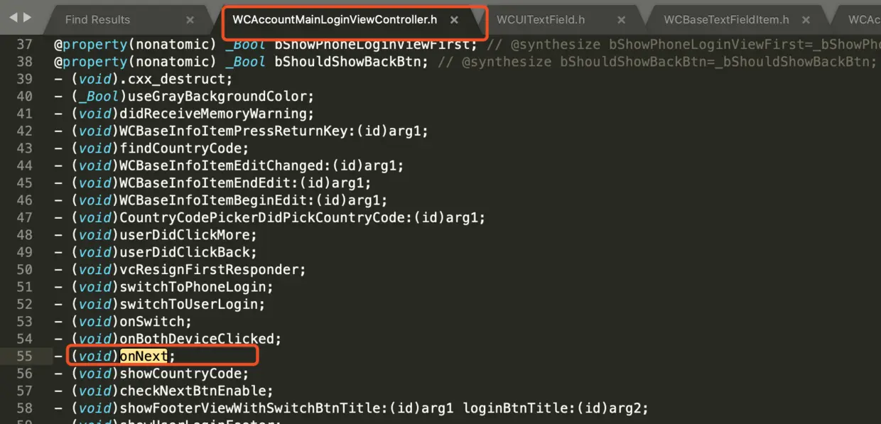 继续使用ViewDebug查找登录方法:onNext,所在类为WCAccountMainLoginViewController,然后头文件核实一下。