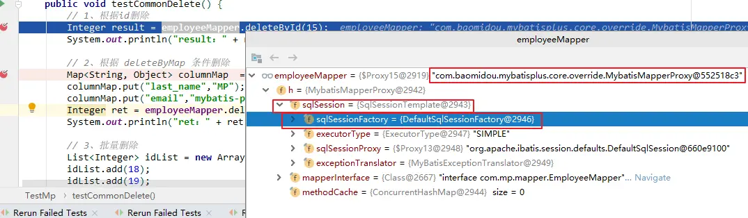 我们在 employeeMapper.deleteById(id)方法中打下断点,可以看到