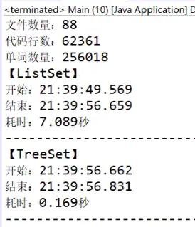 我们对其做单词分析,将一些文件,导入到内存,然后拆分为一个个单词,最终将这多个单词利用ListSet与TreeSet来做添加,删除,搜索操作,最终得出的的时间差异结果如下(可在demo中进行测试)