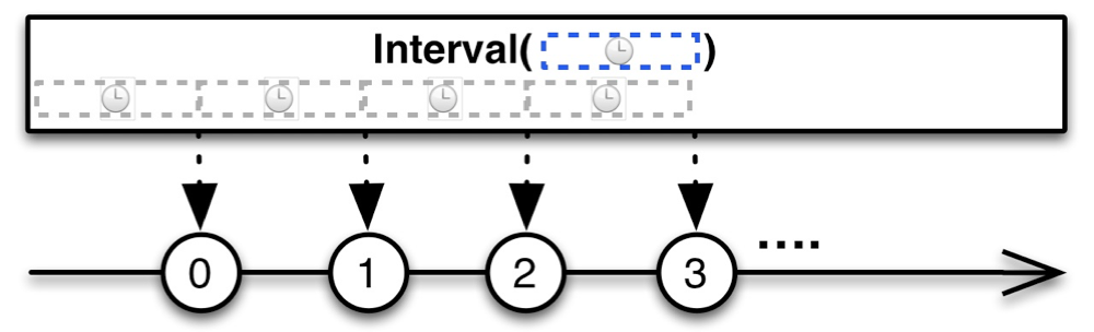 | interval | 每隔一段时间,发出一个索引数,将发出无数个元素 |