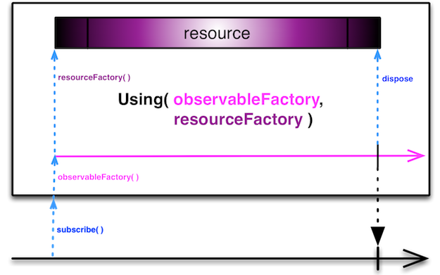 using 使用 using 操作符创建 Observable 时,同时会创建一个可被清除的资源,一旦 Observable 终止了,那么这个资源就会被清除掉了。