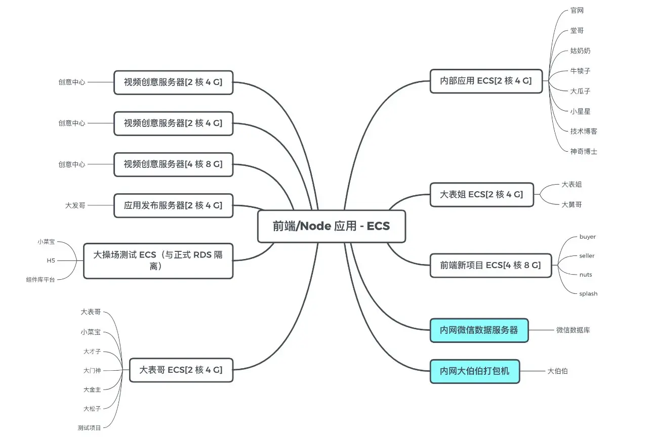 显然每个人的偏好都不同,代码质量也不同,工程架构方式也不同,这为后期的维护带来巨大的麻烦,尤其是做 Node 监控时候,发现没法用一套方案做批量的部署,也同样不能做水平的快速扩展,需要挑选一个框架基于它做统一的封装,从而把前端参与的所有服务端建设可以统一起来,而且现实是我们的前端和 Node 应用由于整个工程的构建与服务部署方式的不同,已经散落到各个服务器上,导致维护成为了瓶颈,也必须到做出改变的时候了,这是当时的部分零散的应用图:
