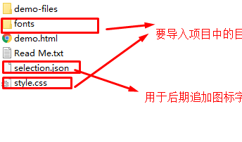 4. 下载到本地后可以发现以下目录,将fonts和style.css目录导入自己的项目中