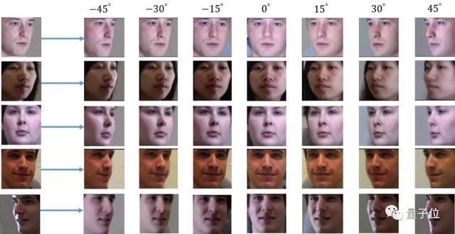 首先是人脸在预先设定的有限数目的视角之间的转换结果。最左边是输入的2D图像,箭头右侧均为生成的,不同视角下的结果。