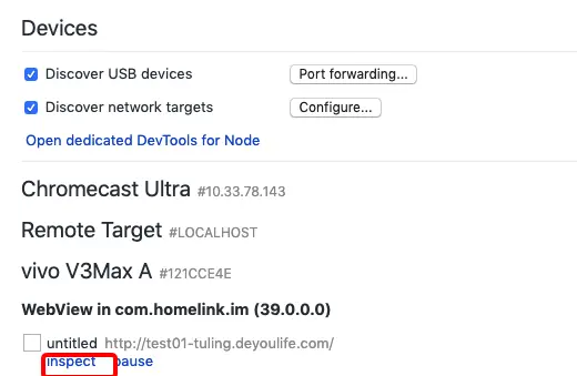 打开Chrome自带的调试移动端的网页chrome://inspect/#devices,就可以看到我们的手机,可以开始进行调试了,请求APP内的webview页面,就可以看到网址,打开inspaect,就可以启动如下devtools