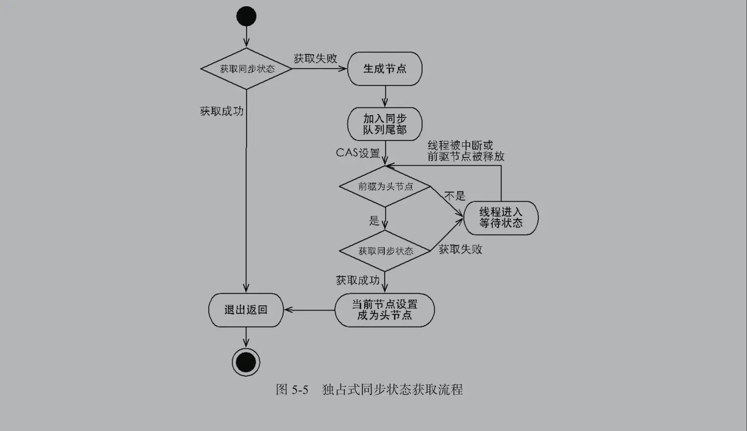 Node.EXCLUSIVE模式的节点,加入到队列的末尾,并且调用acquireQueued方法,让这个节点进入自旋状态。也就是说,这个节点加入同步队列后,就会死循环的去获取同步状态,从而阻塞在了临界区的外面。该线程的唤醒主要依靠前驱结点的出队或者阻塞线程被中断。