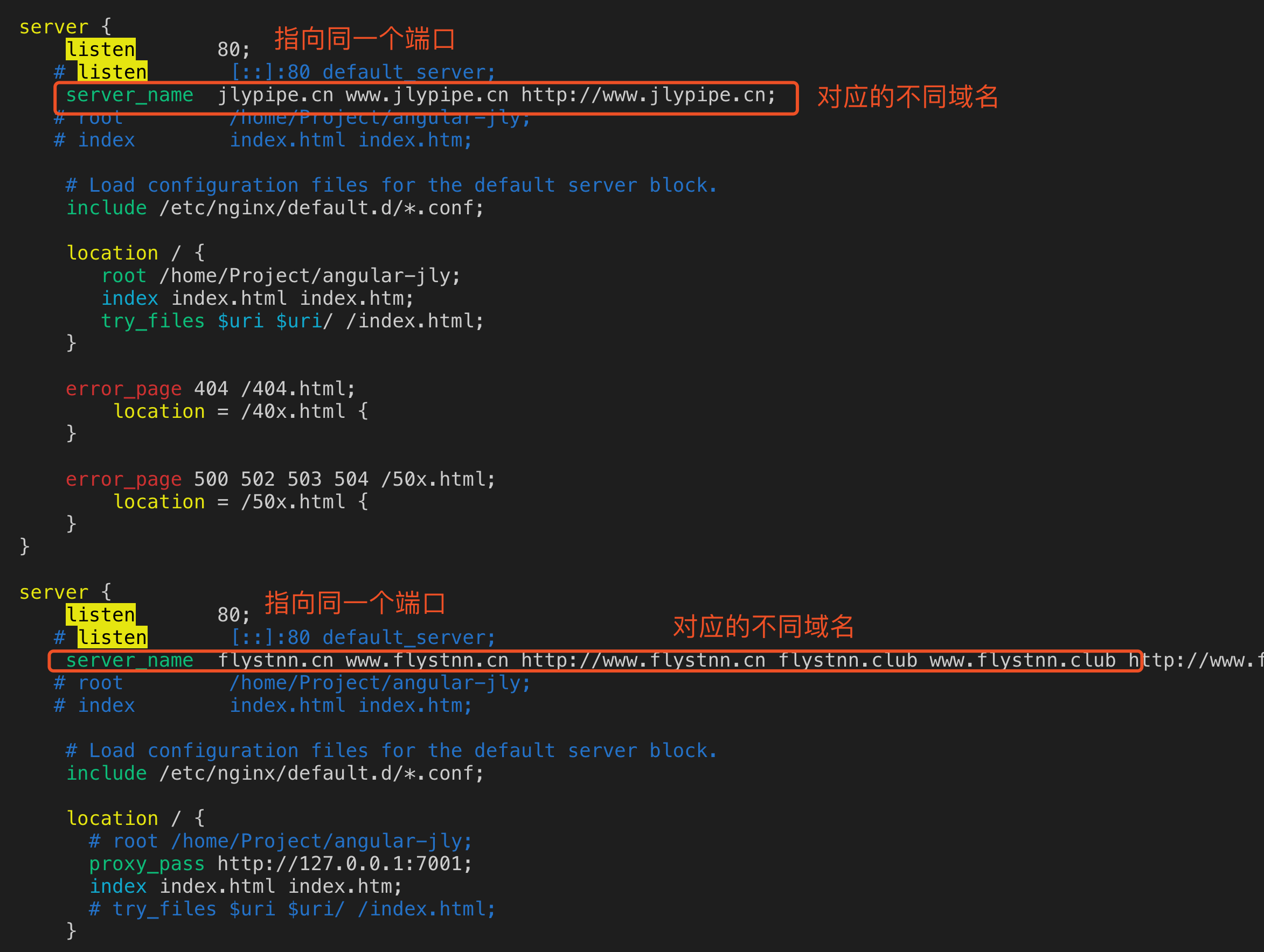 nginx域名解析 雷总的发型 2019-10-27 4,082 阅读1分钟 nginx域名解析 查找nginx位置 locate nginx.conf 1、若两个域名分别指向同一服务器ip的不同端口则需要配置两个server 在第二个服务中增加proxy_pass 指向对应的端口号即可 2、nginx -s reload // 重启nginx