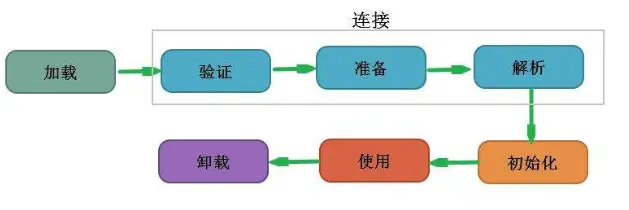一个类从加载到内存开始,一直到被卸载结束,他的整个生命周期包括加载、连接(验证、准备、解析)、初始化、使用、卸载等几个阶段。这几个顺序如下图所示: