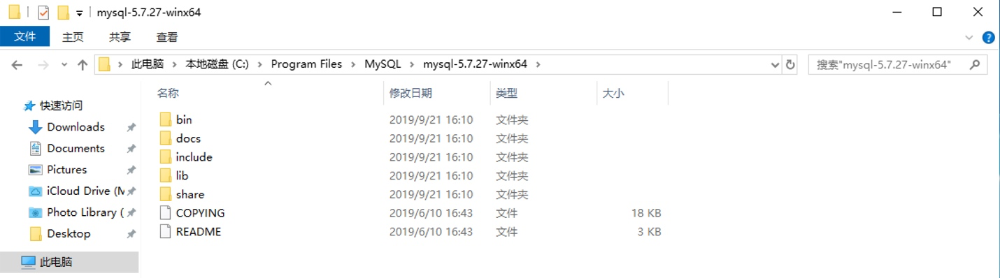 2、解压 mysql-5.7.27-winx64.zip 文件,将解压后的文件拷贝到你的安装目录下