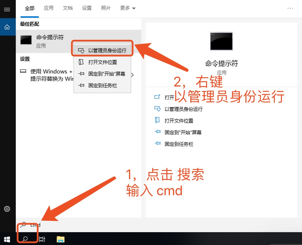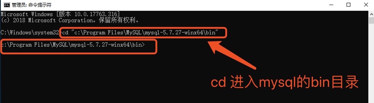 6、初始化MySQL。搜索cmd找到命令提示符,右键以管理员身份运行,进入bin目录: