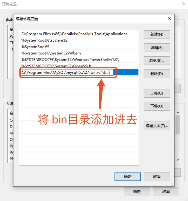 如何进入环境变量的配置界面请参考 进入环境变量配置界面操作步骤 进入环境变量界面,在 系统变量 下面找到 Path编辑,将mysql的bin目录添加进去保存。