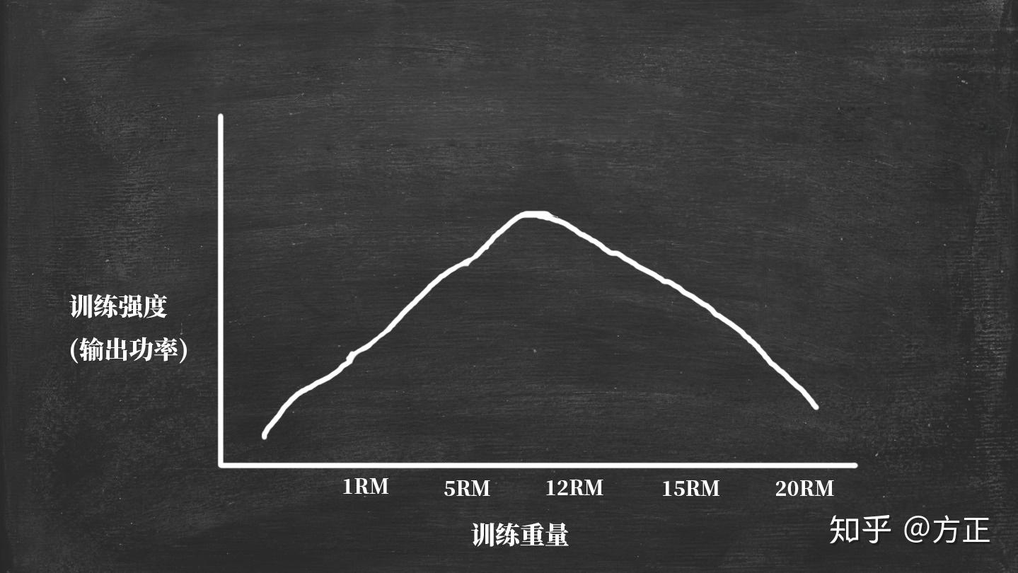 越低的 RM 数,重量使用越大,那么休息时间一般来说会越长。虽然分子(重量)大了,但是分母(时间)会更大。而 8 - 12 RM 之间,我们使用的重量适中,但休息时间可以很短(1分钟)。因此,一般实际上输出功率会更大。而大于某个区间之后,我们的功率又会再次下降,因为训练重量急剧下降了,休息时间可能也会同时增大。