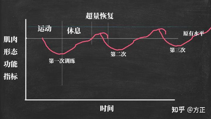 需要特别强调的是,机体出现超量恢复的时间取决于训练对机体的刺激深度和训练强度,刺激深度越深训练强度越大超量恢复出现的时间越晚,且超量恢复的水平越高。一般肌肉出现超量恢复的时间大概是训后72小时左右。