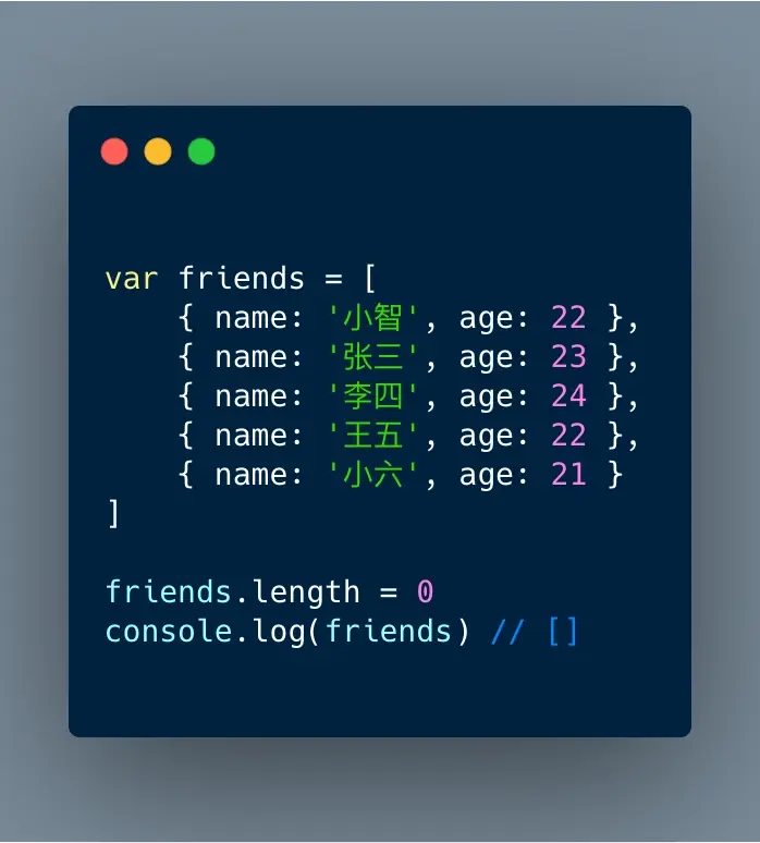 有时候我们需要清空数组,一个快捷的方法就是直接让数组的 length 属性为 0,就可以清空数组了。