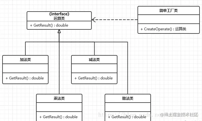 1. 定义一个操作的接口: public interface Operation { public double getResult(double numberA,double numberB) throws Exception; } 2. 定义具体的操作类: public class Add implements Operation{ // 加法计算 public double getResult(double numberA, double numberB) { return numberA + numberB; } } public class Sub implements Operation{ // 减法计算 public double getResult(double numberA, double numberB) { return numberA-numberB; } } public class Mul implements Operation{ // 乘法计算 public double getResult(double numberA, double numberB) { return numberA * numberB; } } public class Div implements Operation { // 除法计算 public double getResult(double numberA, double numberB) throws Exception { if (numberB == 0) { throw new Exception("除数不能为0!"); } return numberA / numberB; } } 3.定义简单工厂类 public class EasyFactory { // 简单工厂,根据字符串创建相应的对象 public static Operation createOperation(String name) { Operation operationObj = null; switch (name) { case "+": operationObj = new Add(); break; case "-": operationObj = new Sub(); break; case "*": operationObj = new Mul(); break; case "/": operationObj = new Div(); break; } return operationObj; } } 4.测试 public class Client { public static void main(String[] args) throws Exception { Operation add = EasyFactory.createOperation("+"); Operation sub = EasyFactory.createOperation("-"); Operation mul = EasyFactory.createOperation("*"); Operation div = EasyFactory.createOperation("/"); } }-