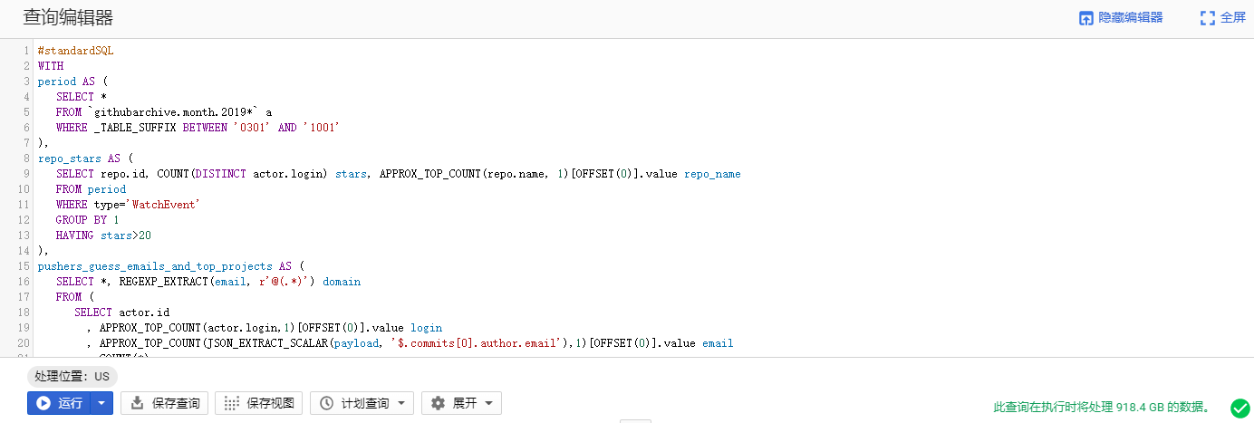 从下图中可以看到,本次查询统计将会处理 918.4GB 的数据。