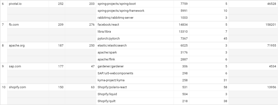 排在 6-10 位的分别是 Pivotal、Facebook、Apache、SAP 和 Shopify。