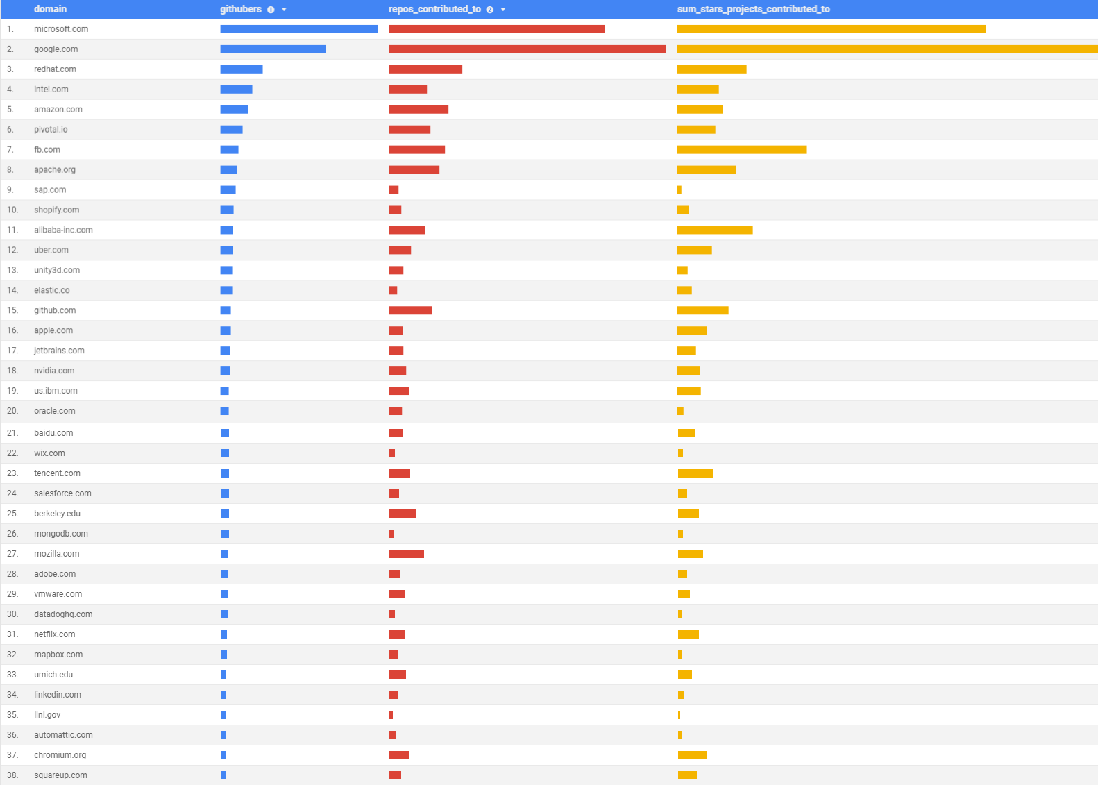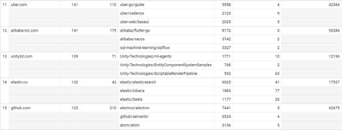 - 微软谷歌均有超过 1000 名员工(githubers)向多个 GitHub 仓库(repos_contributed_to) push 代码;
