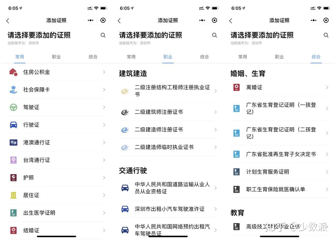 以广东地区的粤省事小程序为例,根据它的页面显示,粤省事提供了 56 种不同的证照,包含了常用、职业和综合三大类。