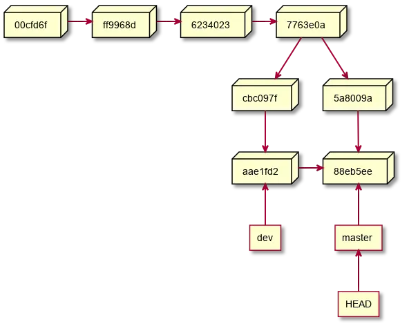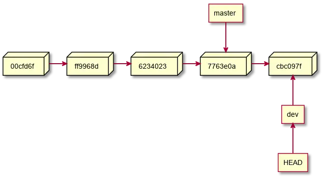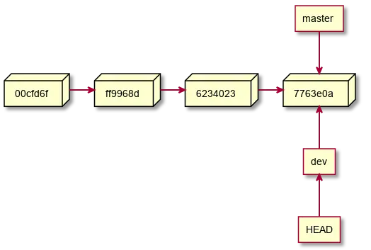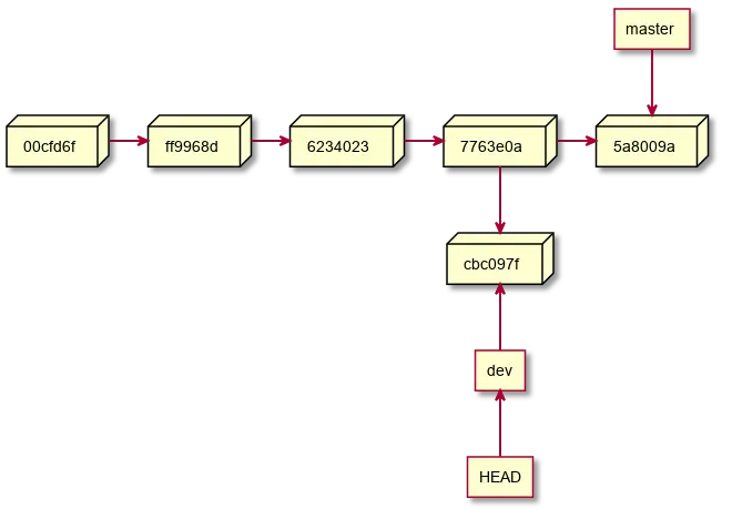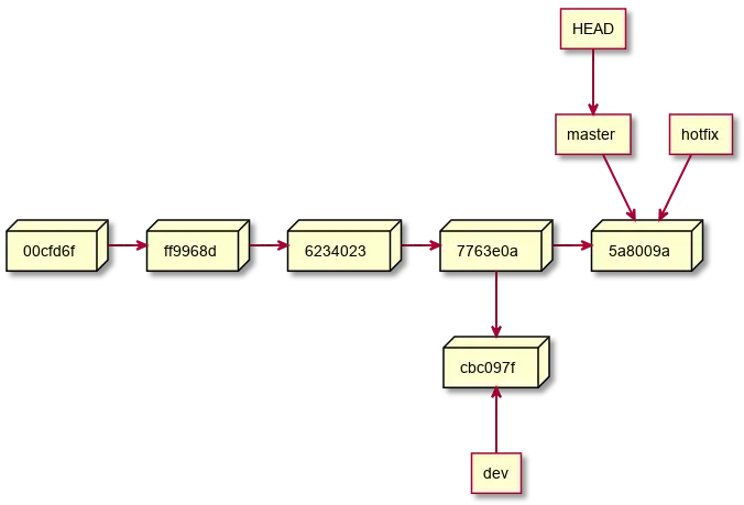 此时我们的dev分支和master分支已经分叉,因为master分支包含了hotfix分支的提交,而dev分支没有,你可以使用git merge master将 master 分支合并入 dev 分支,或者你也可以等到 dev 分支完成其使命,再将其合并回 master 分支。